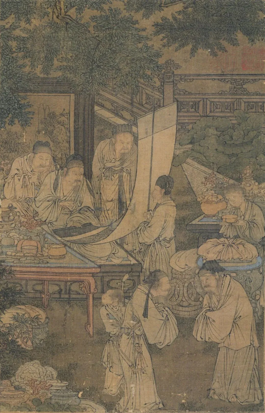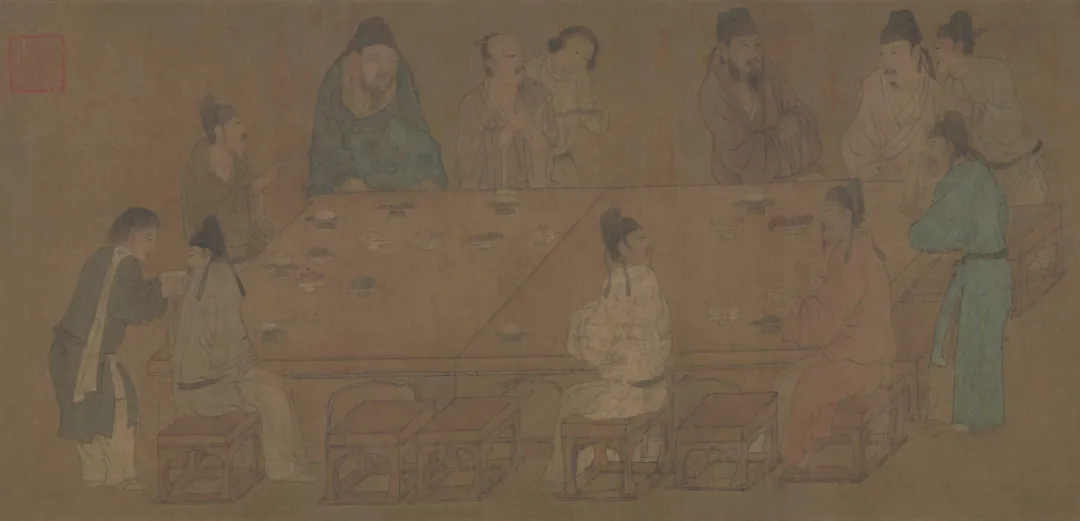 这幅画和赵佶的《文会图》有相似之处,且根据桌上桃子、葡萄等水果推测,宴会时节应该是夏秋之际。