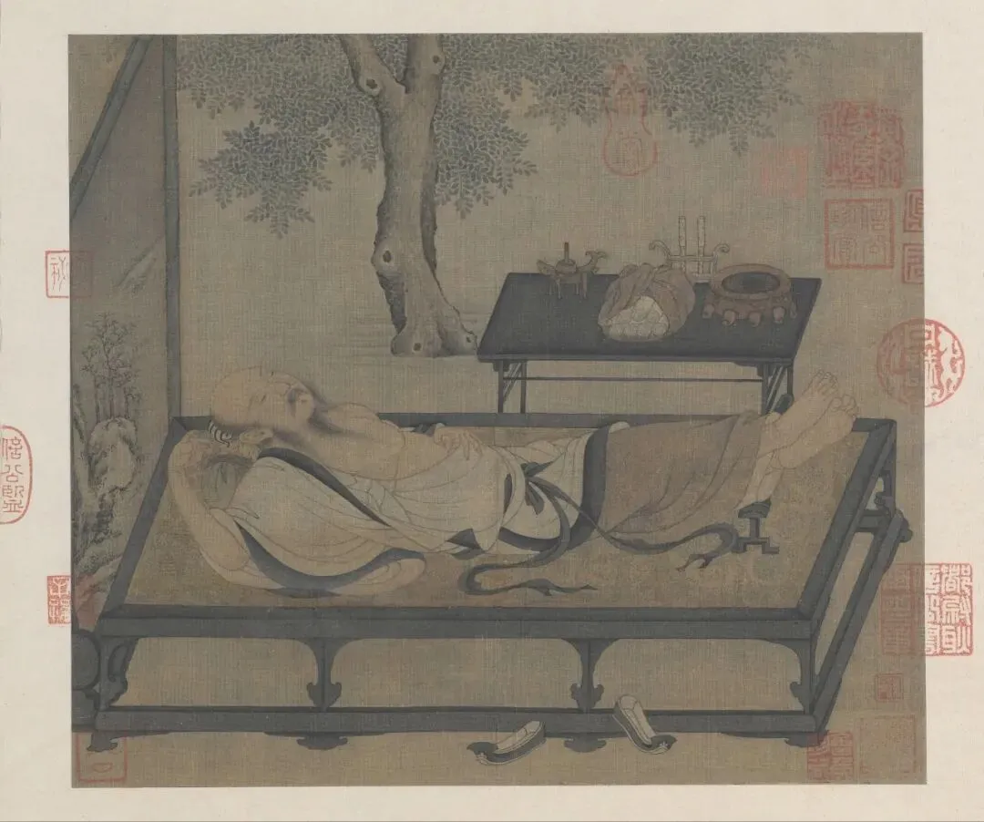 午饭过后,照例要午睡片刻。在盛夏的绿槐浓荫下,一男子袒胸翘足,仰卧在凉榻上,闭目养神,怡然自得。床头立着一面屏风,上面绘有雪景寒林图,给人一种清凉扑面的感觉。在他伸手可及的茶几上,放着书卷、香炉、蜡台等物件。