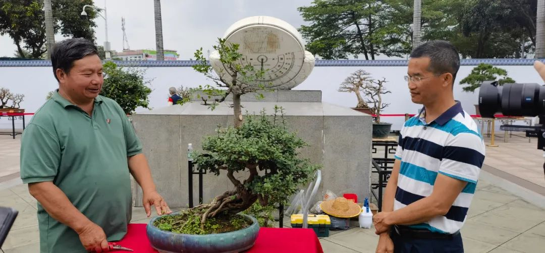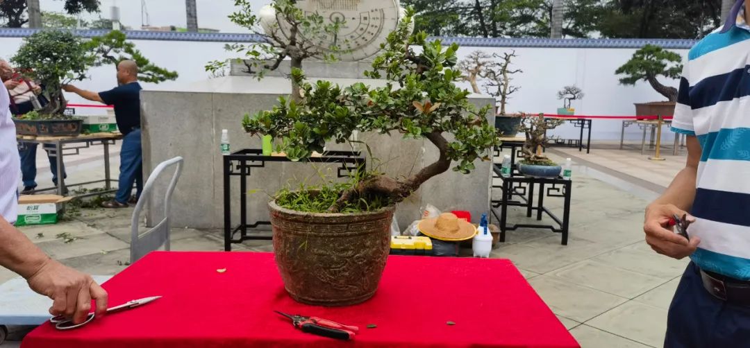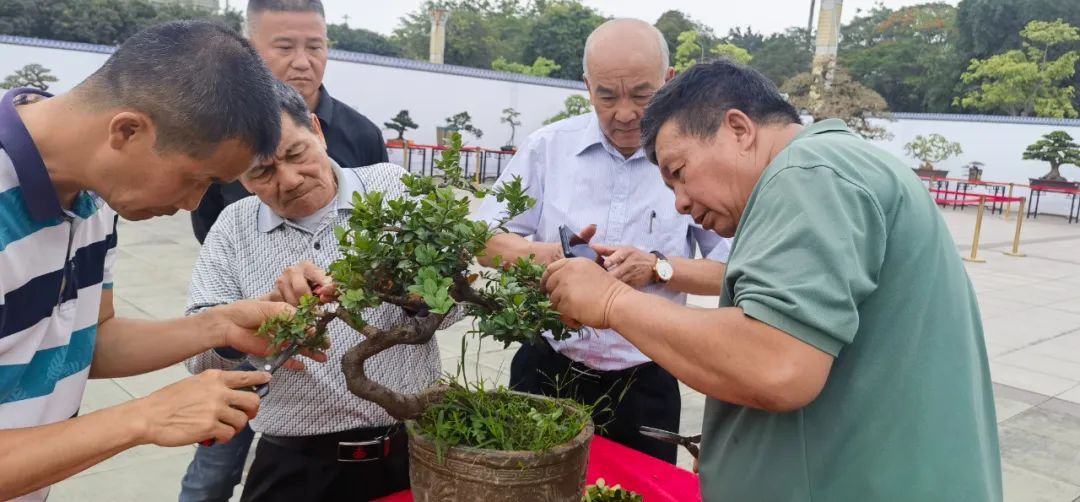 在山桔的换盆演示中,何卫泉秘书长分享了换盆技巧,他表示,换盆前一段时间避免对盆景施大量的肥。在换盆时,围绕着盆的内边缘用螺丝刀通过插、撬等方式进行松土,使泥土与盆之间产生缝隙,有利于盆与土分离。在演示结束后,现场观摩的会员们即时动手操作,体验了修剪的乐趣。