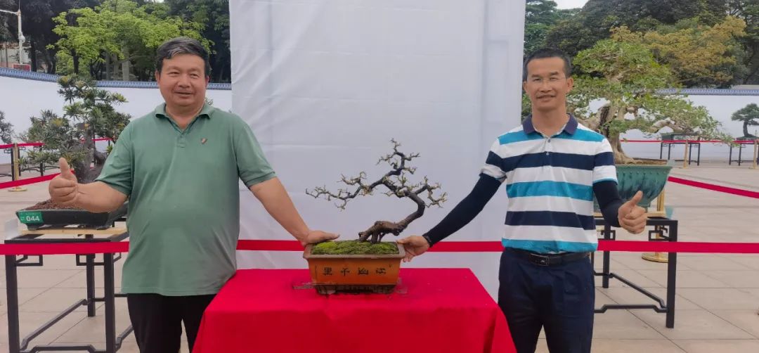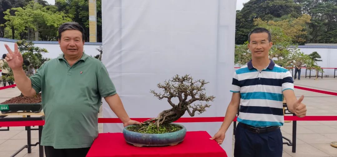 勒流盆协技术顾问周锡祥老师(左)、秘书长何卫泉(右)与换盆、修剪后的山桔合影