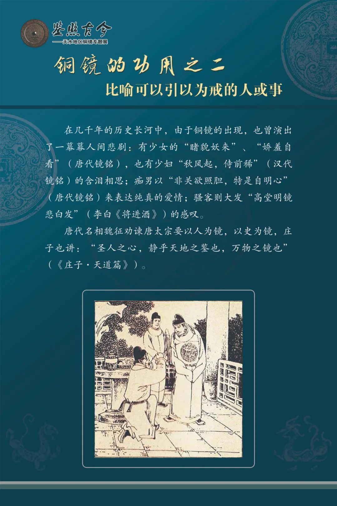 此次展览精选天水市博物馆、秦安县博物馆收藏的天水地区87面珍品铜镜展出,时间跨度从两汉到清代,这些铜镜造型优美,纹饰精巧,题材丰富,铭文独特,制作精湛,基本反映了中国古代各时期铜镜艺术发展的概貌,展示了中国青铜文化的博大精深,带领观众走进铜镜的光影世界,近距离感受青铜古镜的艺术魅力。