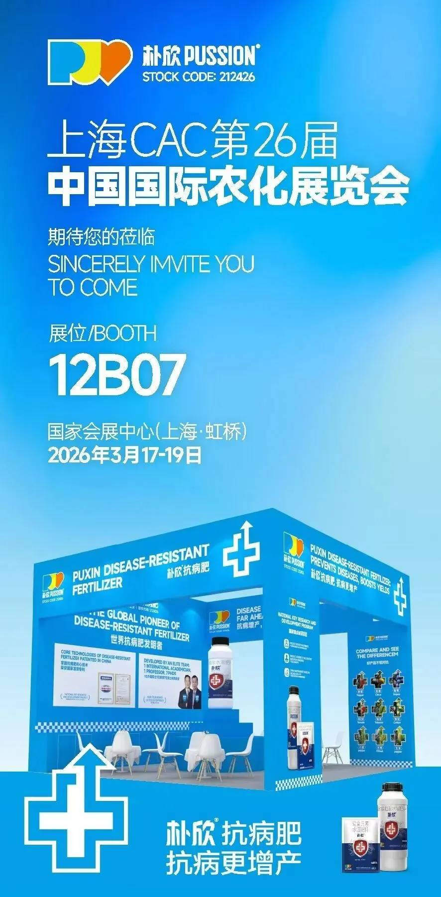 3月17—19日,上海CAC展会期间,欢迎全国各地农资同仁、渠道伙伴、种植大户莅临12B07 朴欣肥业展位。本次展会,朴欣抗病肥系列将作为核心亮点重磅展出
