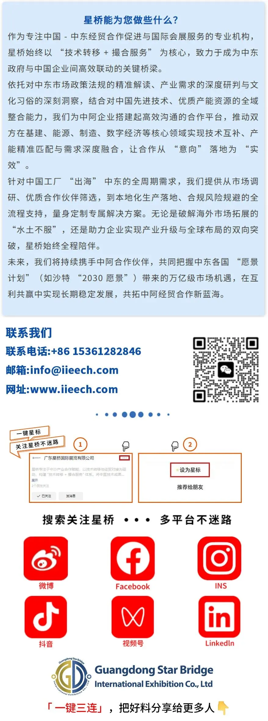 ?重磅参展阵容:超 100 家参展企业、多国专业代表团齐聚,汇聚行业龙头、优质供应商、创新企业,带来前沿产品、技术与解决方案。精准专业观众:吸引中东、海湾地区、北非的企业主、经销商、机械工程师、投资者、采购经理、政府官员等全产业链专业人士,精准触达决策层。