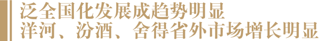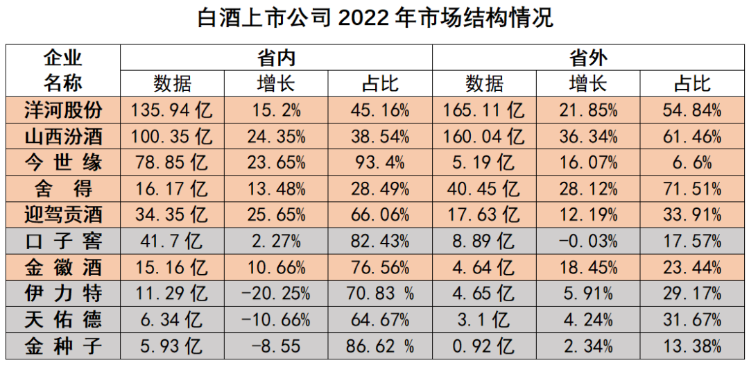 可以看出,不管是洋河、汾酒、今世缘、舍得还是迎驾贡酒、金徽酒,其2022年在省内外市场均有着亮眼的成绩和表现。对于省外市场占比超过50%的洋河、汾酒和舍得来说,其2022年在省外市场的发展依旧迅猛,均超过了20%,此外,他们在省内市场依旧发力,也实现了不错的发展。