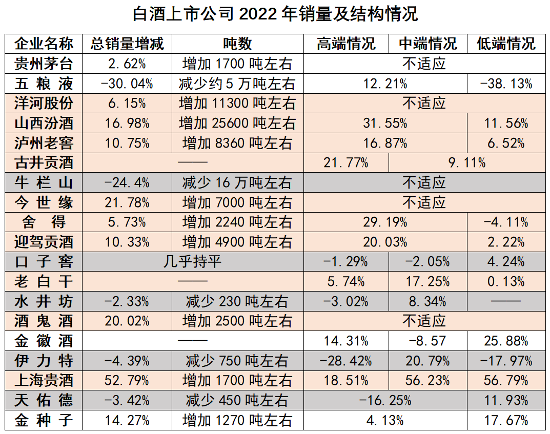 在存量竞争时代的背景下,通过白酒上市公司销量的增减,以及高中低档不同价位带销量的变化,也能进一步反映当前白酒行业两极分化加剧的趋势。
