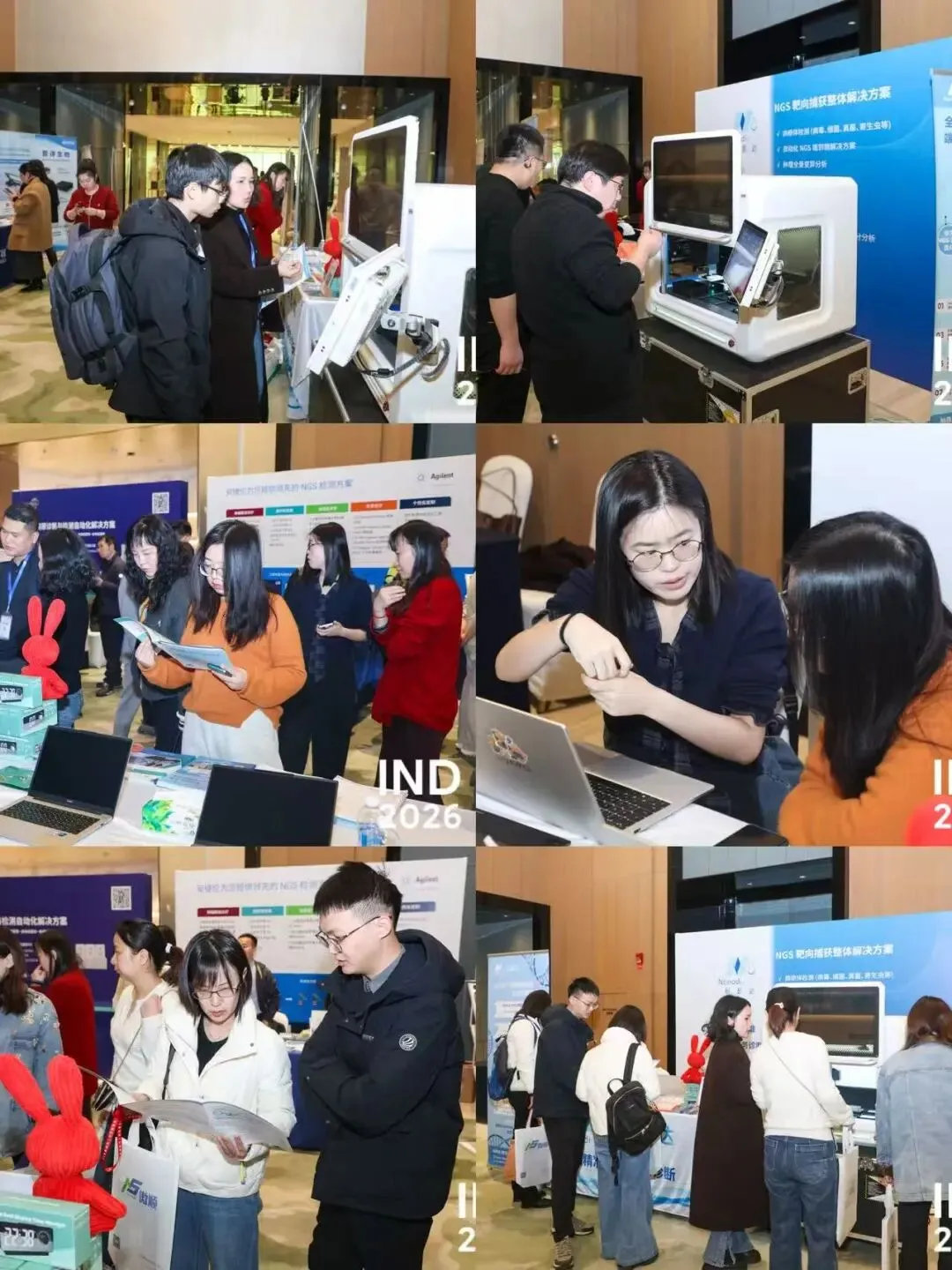 其中,自动化设备展区备受关注。多位参会嘉宾来到展台,与纳昂达销售及市场团队展开交流,深入了解 NadAuto-16 基因测序文库制备仪的核心功能与技术优势。现场还进行了 NadAuto-16 基因测序文库制备仪的自动化运行流程演示,参观者近距离观摩了设备运行过程,对自动化设备在实验流程标准化、操作便捷性以及效率提升方面的优势有了更加直观的认识,也为后续技术交流与合作提供了契机。