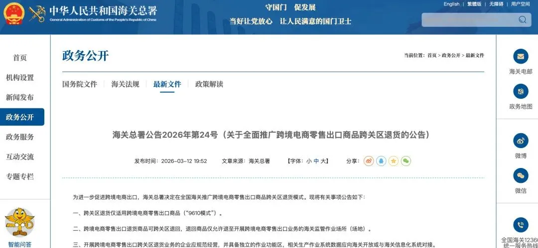为进一步促进跨境电商出口,海关总署日前发布《关于全面推广跨境电商零售出口商品跨关区退货的公告》(2026年第24号),自2026年4月1日起施行。