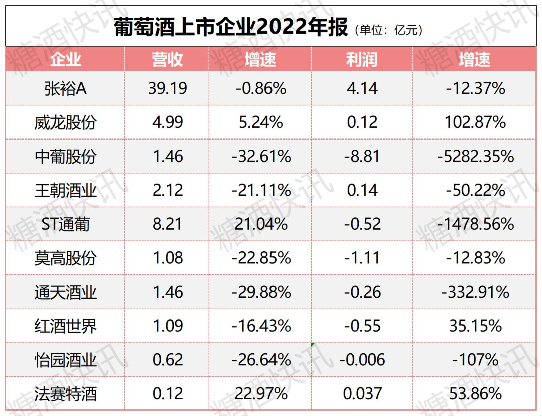 4月,10家葡萄酒上市企业陆续发布了2022年报。综合年报数据来看,2022年葡萄酒企业的情况不算乐观:10家公布年报的葡萄酒上市企业中,仅张裕、威龙、王朝、法赛特酒四家企业盈利。营收方面,除威龙、ST通葡、法赛特酒三家是正向增长外,其余企业均有不同程度的下滑。