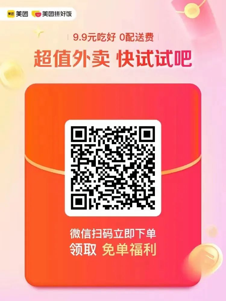 美团出了一个新的外卖平台,主打优惠,全场均价5.9元,还不需要配送费,太便宜了。微信扫码直接下单,赶紧来试试吧!