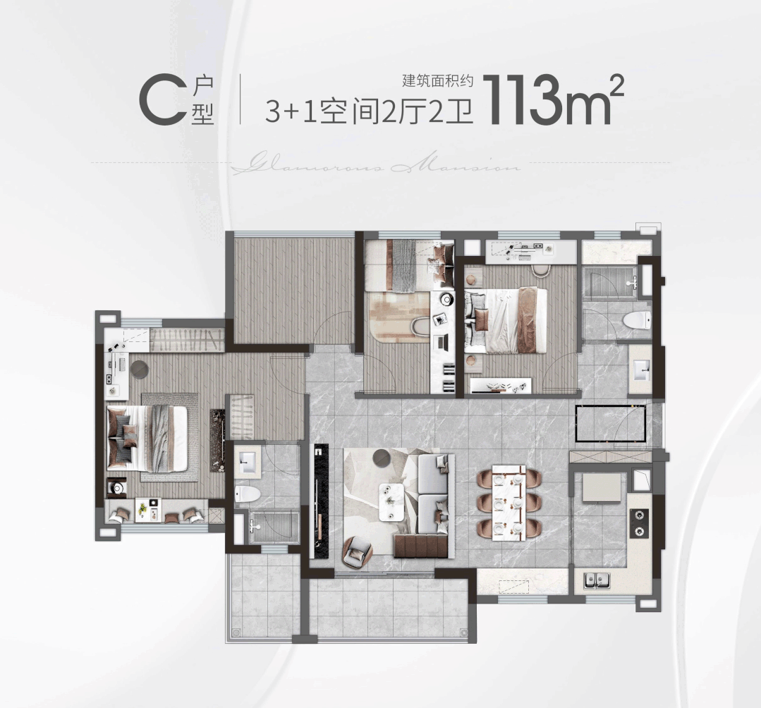 建面约113㎡户型,则是拥有大横厅的设计,整个空间拥有IMAX级全面屏采光!