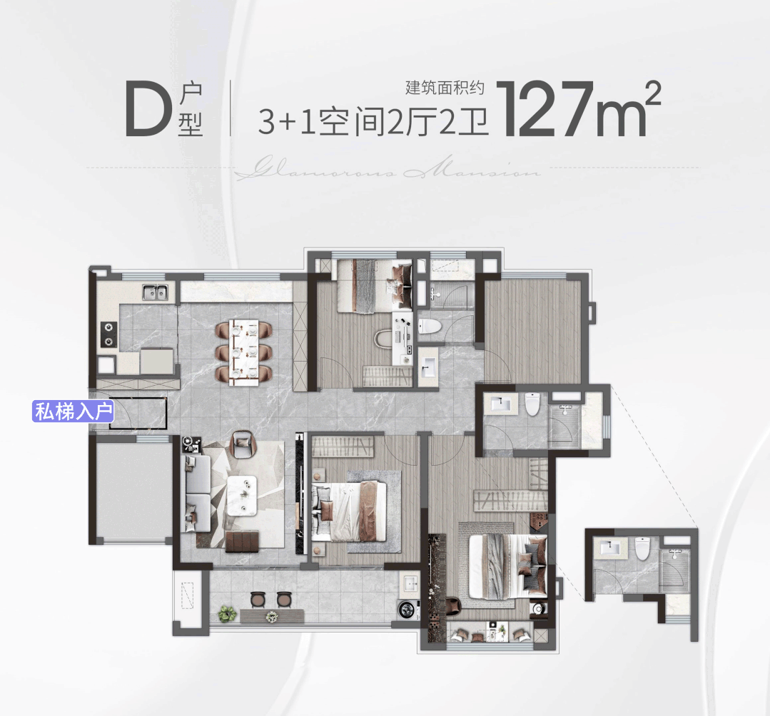 建面约127㎡户型,南北对流、无死角360°采光,就足以让人尖叫了。
