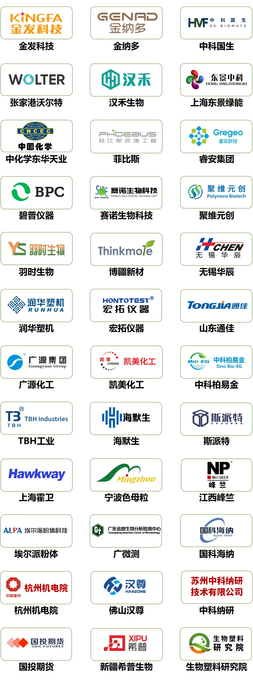 分论坛冠名:中科国生(呋喃生物基材料)、沃尔特(塑料干燥机)、汉禾(生物塑料、新型电池负极材料、生物基环氧树脂)、东景中科(生物降解材料与制品)、正茂智造(双螺杆挤出造粒机、注塑机)