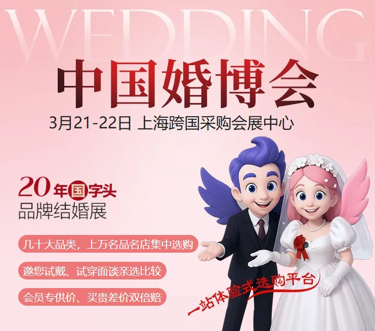 上海婚博会即将开展!经过十几年的行业深耕,从今年开始“婚芭莎-中国婚博会”将覆盖全国45个主要城市70%-80%结婚消费人群、囊括全国摄影、婚纱礼服、婚庆公司、婚宴、结婚钻戒、婚庆用品、婚房装修、婚车、新娘美容等核心结婚消费行业所有知名品牌企业。