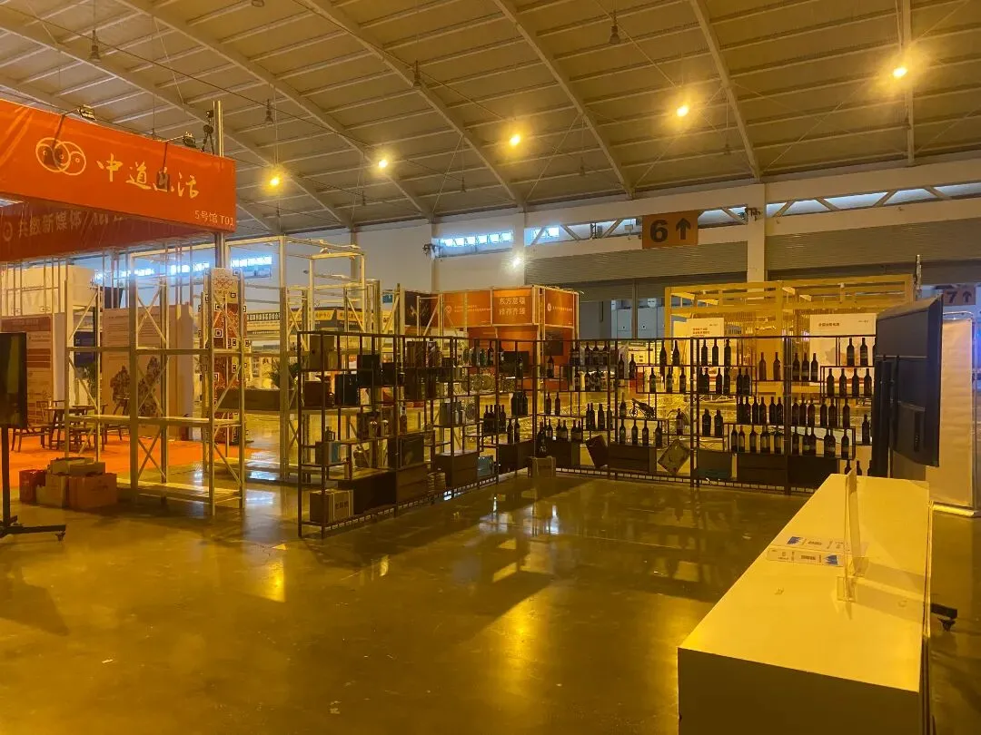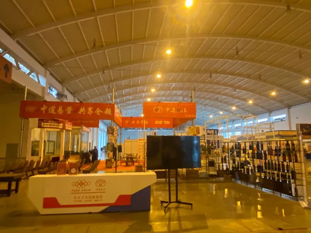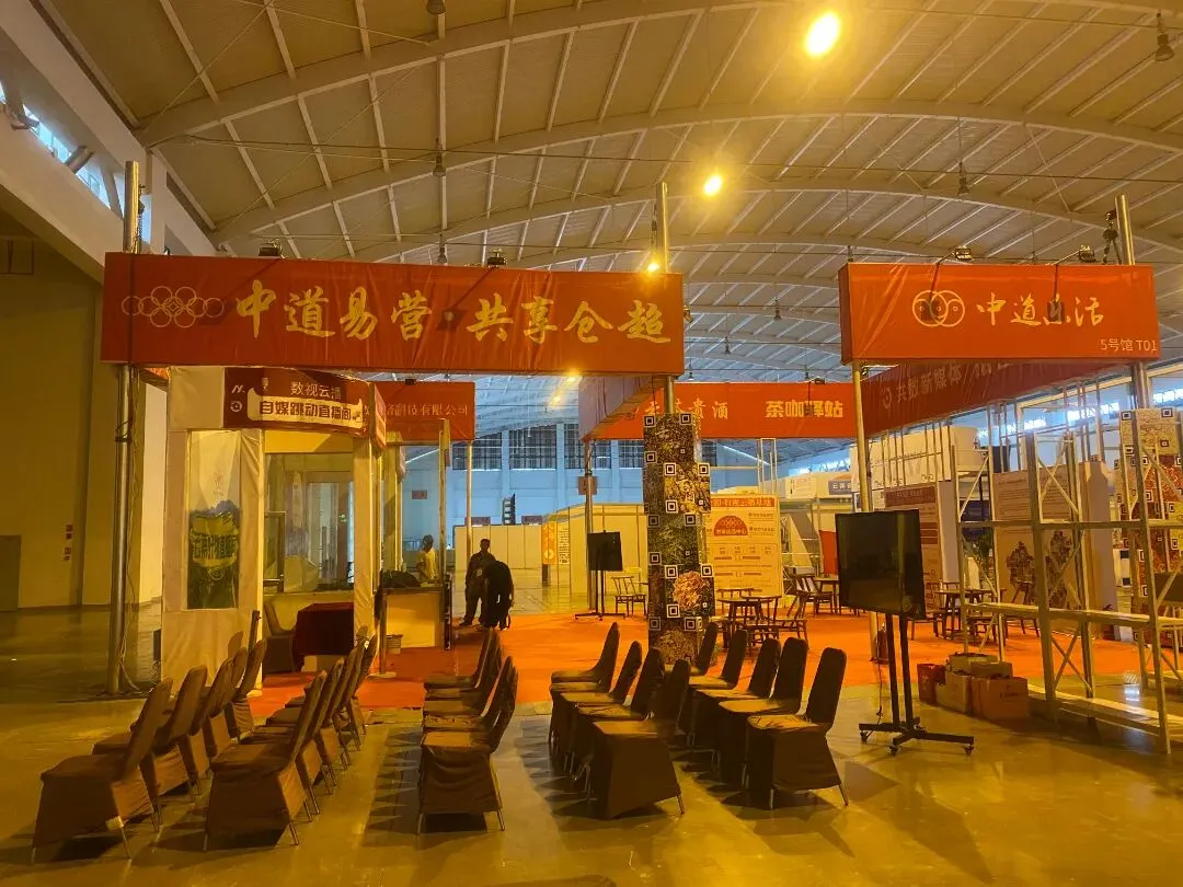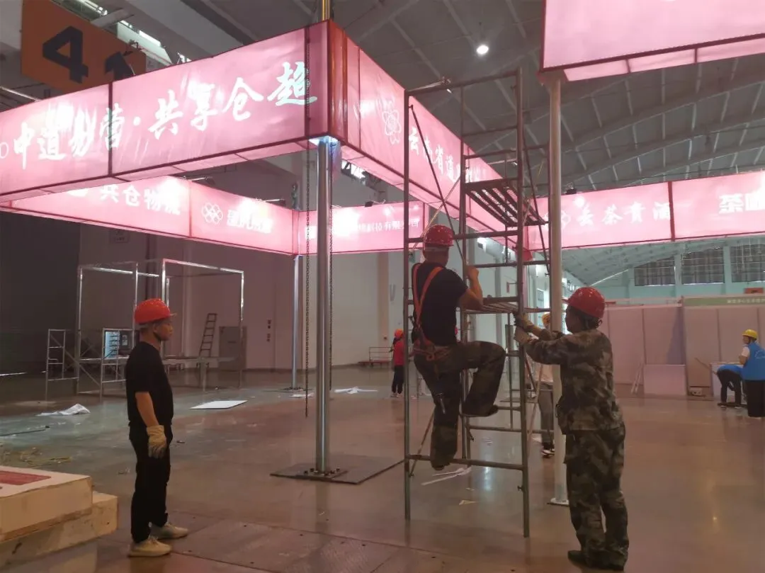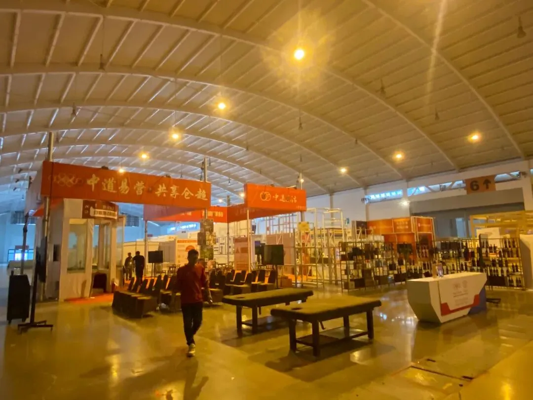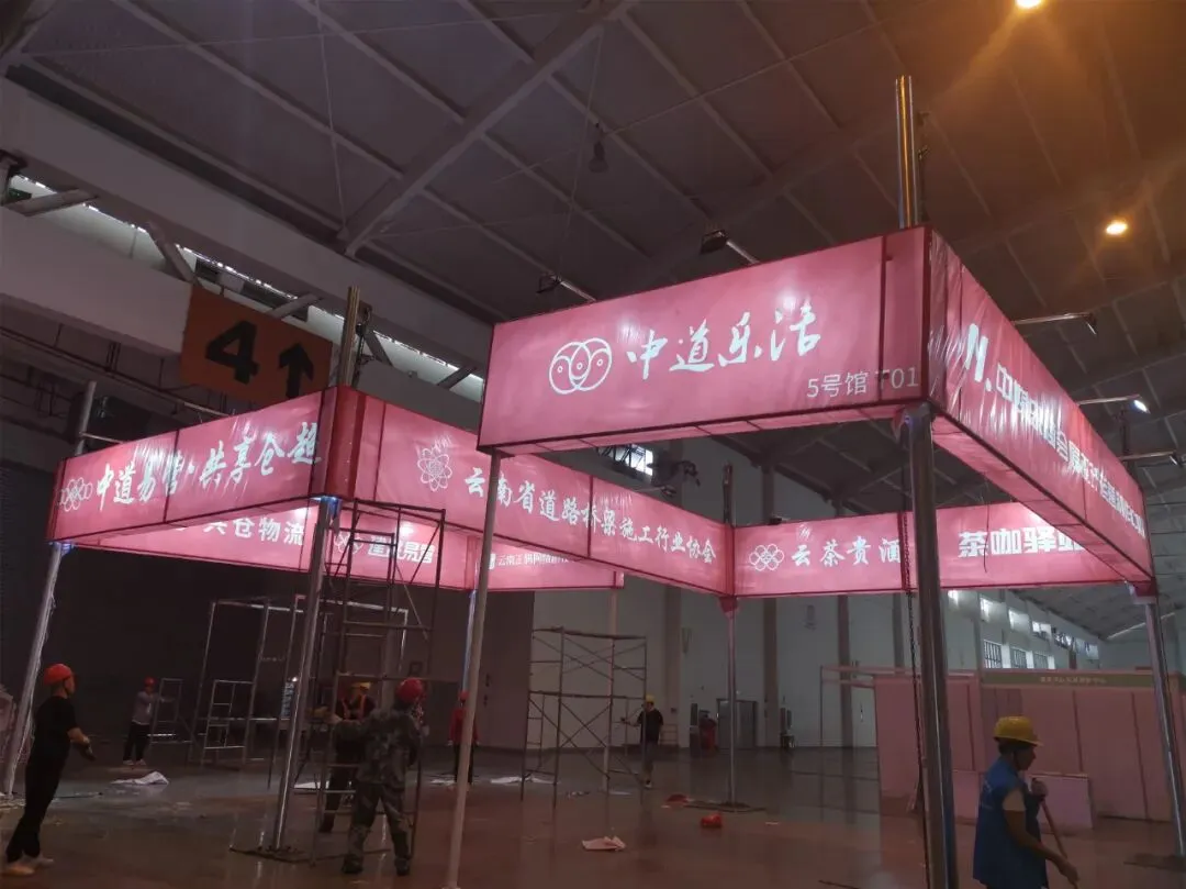 中午时分,随着灯箱装置的到位和直播间架设、地毯铺设等工作完成,特装展厅的部分已经初见雏形。