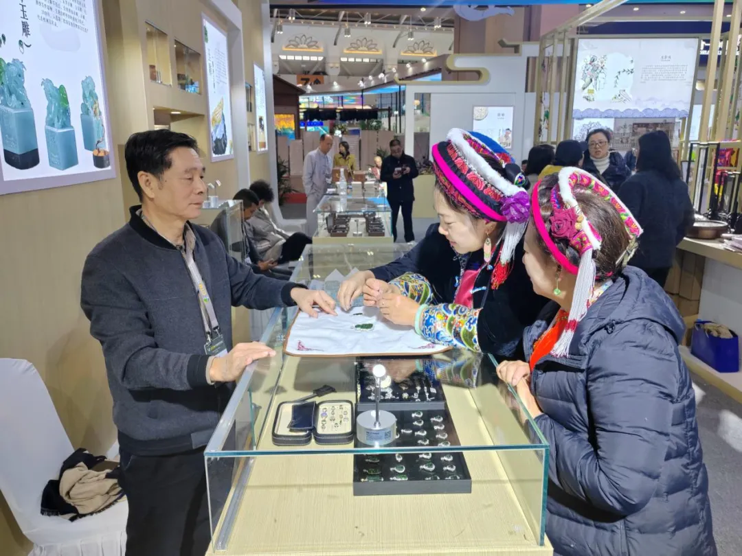 本次非遗精品展区遴选国内30个国家级、省级非遗项目参展,我省潮绣、阳美翡翠玉雕大放异彩。