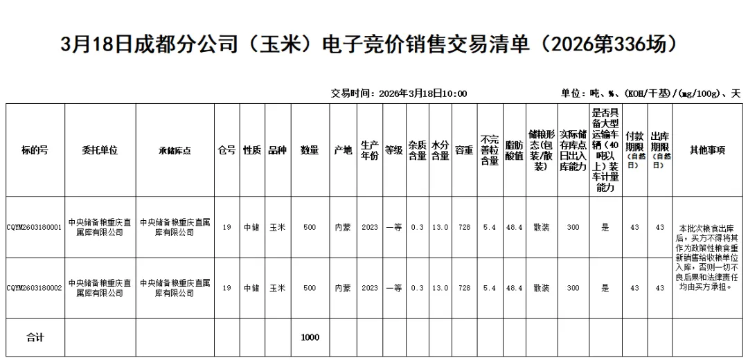 受中国储备粮管理集团有限公司成都分公司委托,重庆市粮油批发市场有限责任公司(即国家粮食重庆交易中心,以下简称“批发市场公司”)定于2026年3月18日10:00举办成都分公司(玉米)电子竞价销售交易会,现将有关事项公告如下: