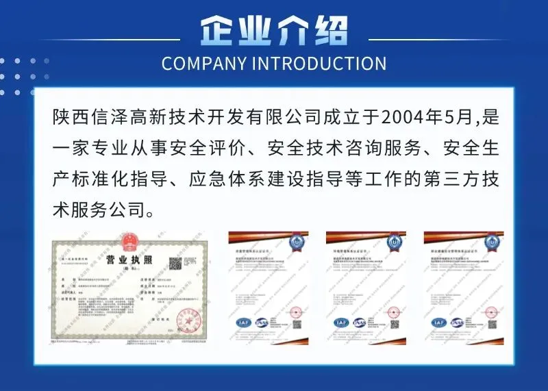 陕西信泽高新技术开发有限公司将始终秉持“安全第一,客户至上,诚信守约,优质高效,依法评价,质量一流”的服务理念,持续提供专业、可靠的技术支持,竭诚为社会各界提供安全评价与咨询服务,以专业积淀与技术实力,筑牢坚实可靠的技术支撑与服务保障,助力客户防范安全风险、实现合规发展。