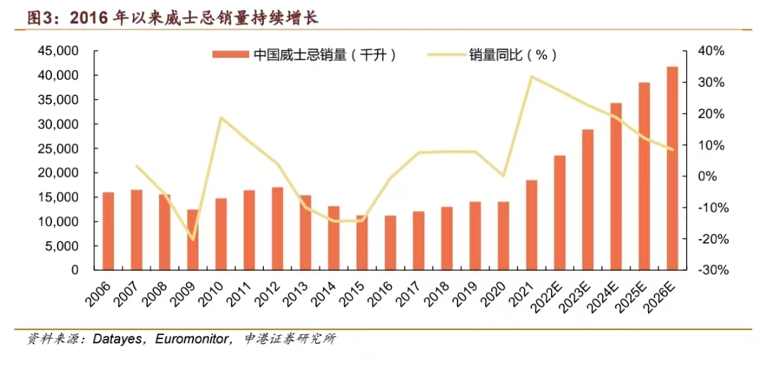 市场调查公司Euromonitor数据显示,2022年中国酒精饮料消费量由2021年517亿升下降至505亿升,但中国的威士忌消费却自2016年开始持续增长,到2021年达到约1851万升,预计2025年达到3850万升,近五年中国威士忌消费量平均增速超两位数,是近些年消费市场炙手可热的烈酒品类。