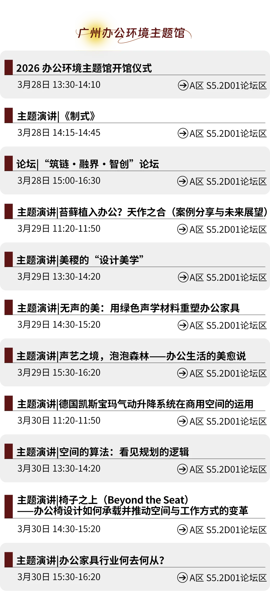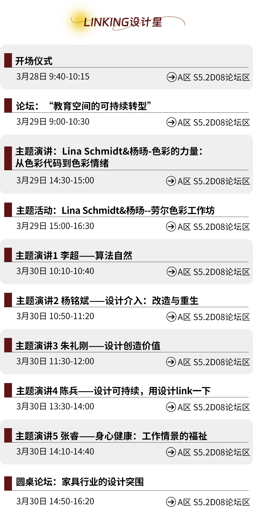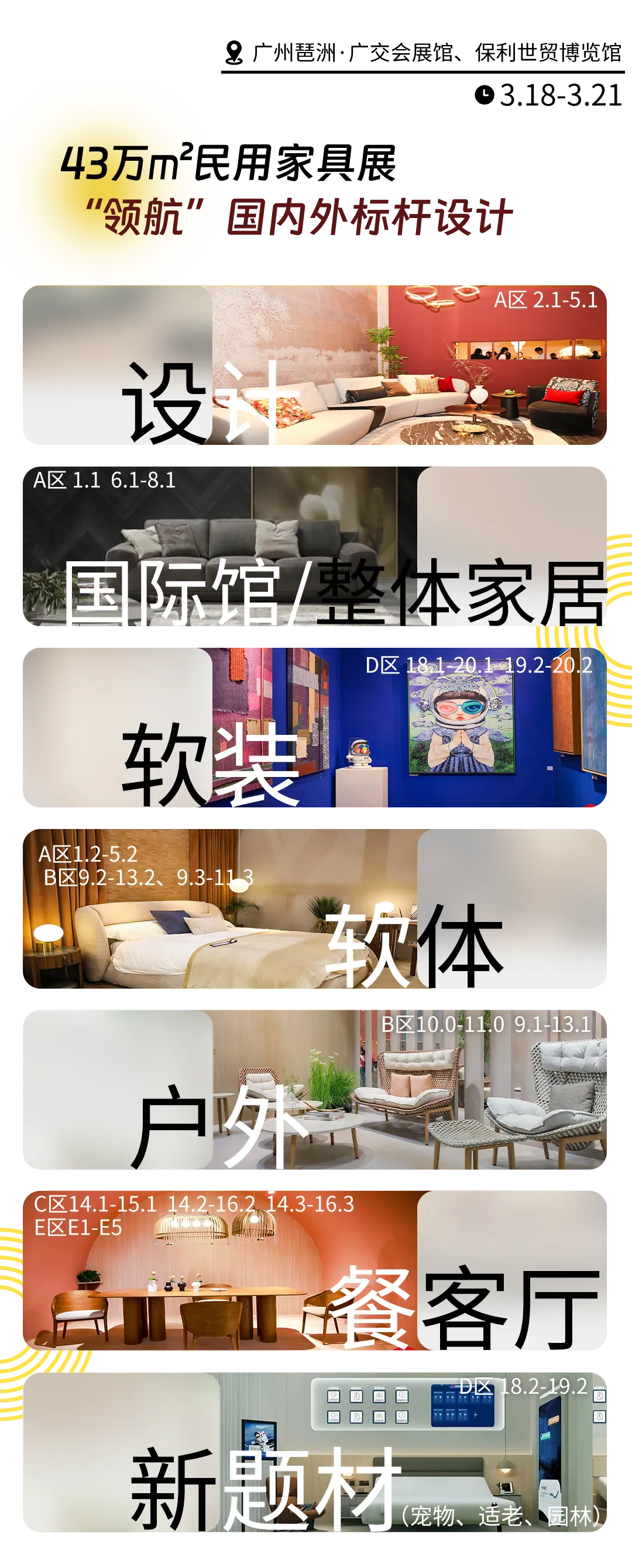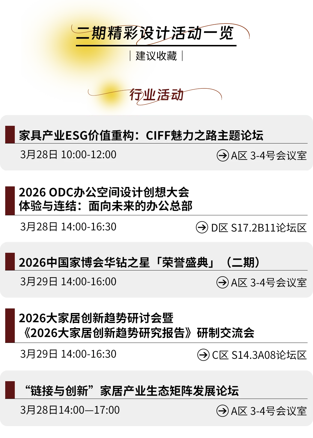 其中,一期民用家具展以「领航」为主题,不仅重磅呈现4万平方米的当代设计展,打造行业深度赋能平台,还首次设立适老、宠物、新零售等新赛道专区,打造大家居产业的年度风向标;二期办公商用特展聚焦「可持续创新」,探索办公空间的未来形态,每一个特展都是设计人的灵感打卡地!设备配料展以「链动全球」为核心主题,升级两大重磅活动。呈现供应链源头尖端技术美学与材质灵感!