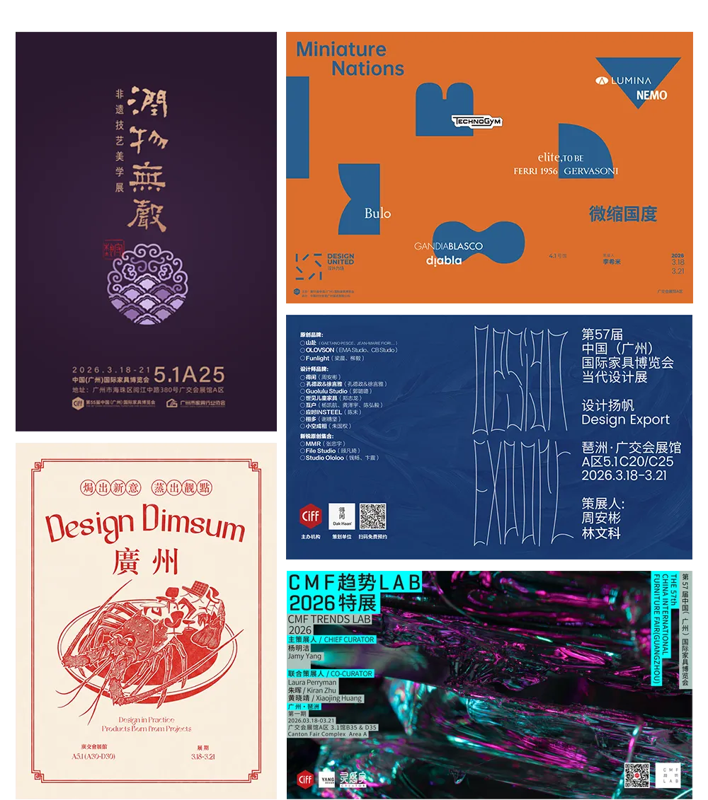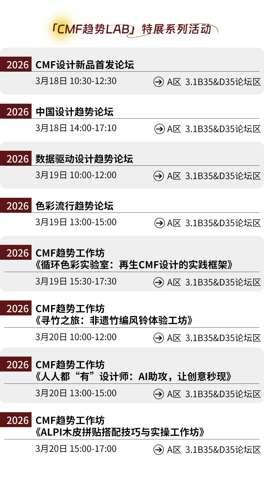 「CMF趋势LAB」从材料与色彩趋势切入,提供可落地的解决方案;「设计力场」引入国际品牌视角,为商业设计提供出海参照;「设计点心」以项目实践为线索,呈现从需求到产品的转化逻辑;「设计扬帆」聚焦中国设计出海,探讨文化叙事与商业路径;「非遗技艺美学展」则从技艺传承与创新出发,探寻传统资源的当代转化。