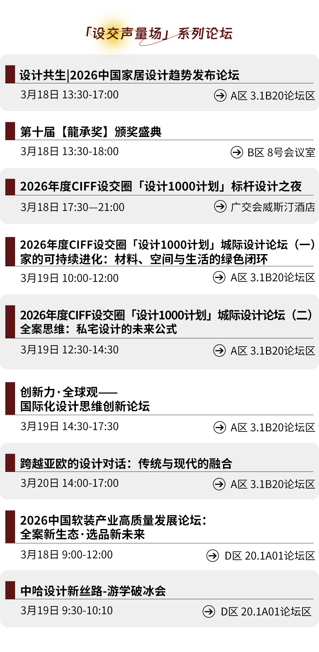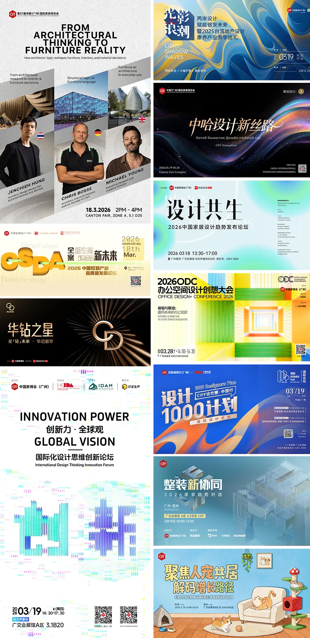 CIFF围绕家居设计、CMF设计、数智、色彩、宠物家居、办公空间等6大趋势CIFF广州|趋势解码2026:CIFF广州年度6大战略洞察,自然疗愈、东方美学、设计出海、AI+设计、CMF设计、乐龄友好等9大主题CIFF广州 | 定义新趋势!民用家具展九大设计关键词揭晓,打造华钻之星、光影与浪潮 两岸设计赋能银发未来暨2026台湾地产设计康养产业美学巡礼、聚焦人宠共居·解码增长路径论坛、2026 ODC办公空间设计创想大会等多元论坛活动。