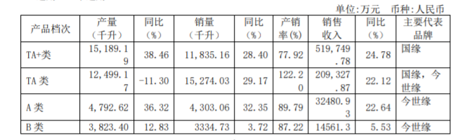 特A类产品(出厂指导价100—300 元价位带产品,含税)实现营业收入20.93亿元,同比增长22.12%。