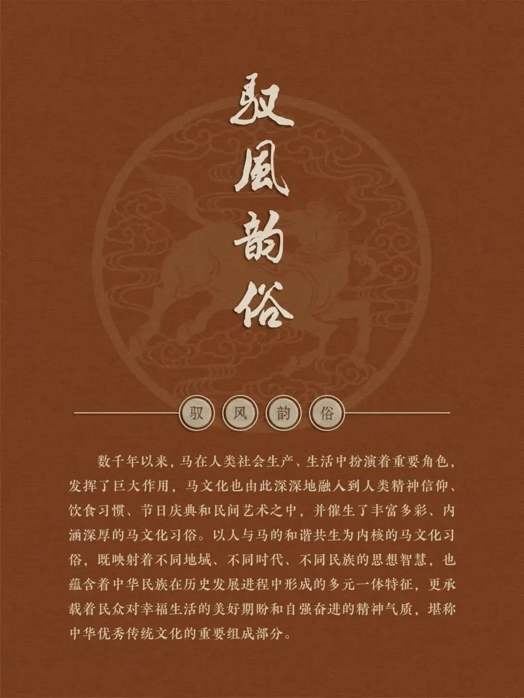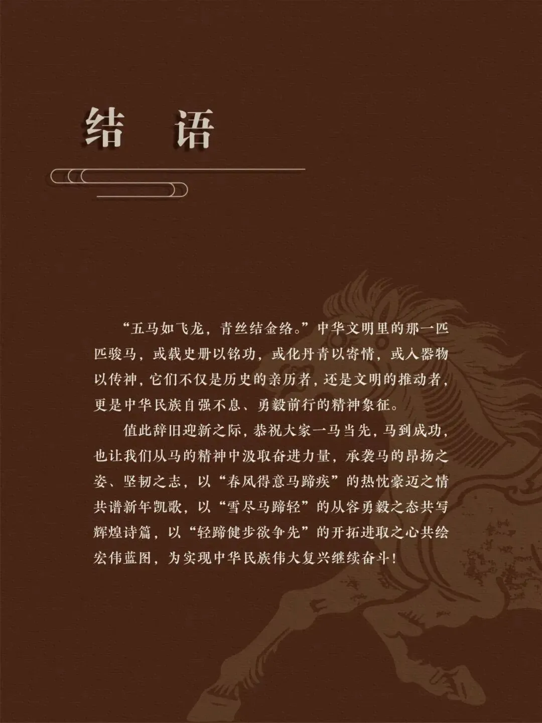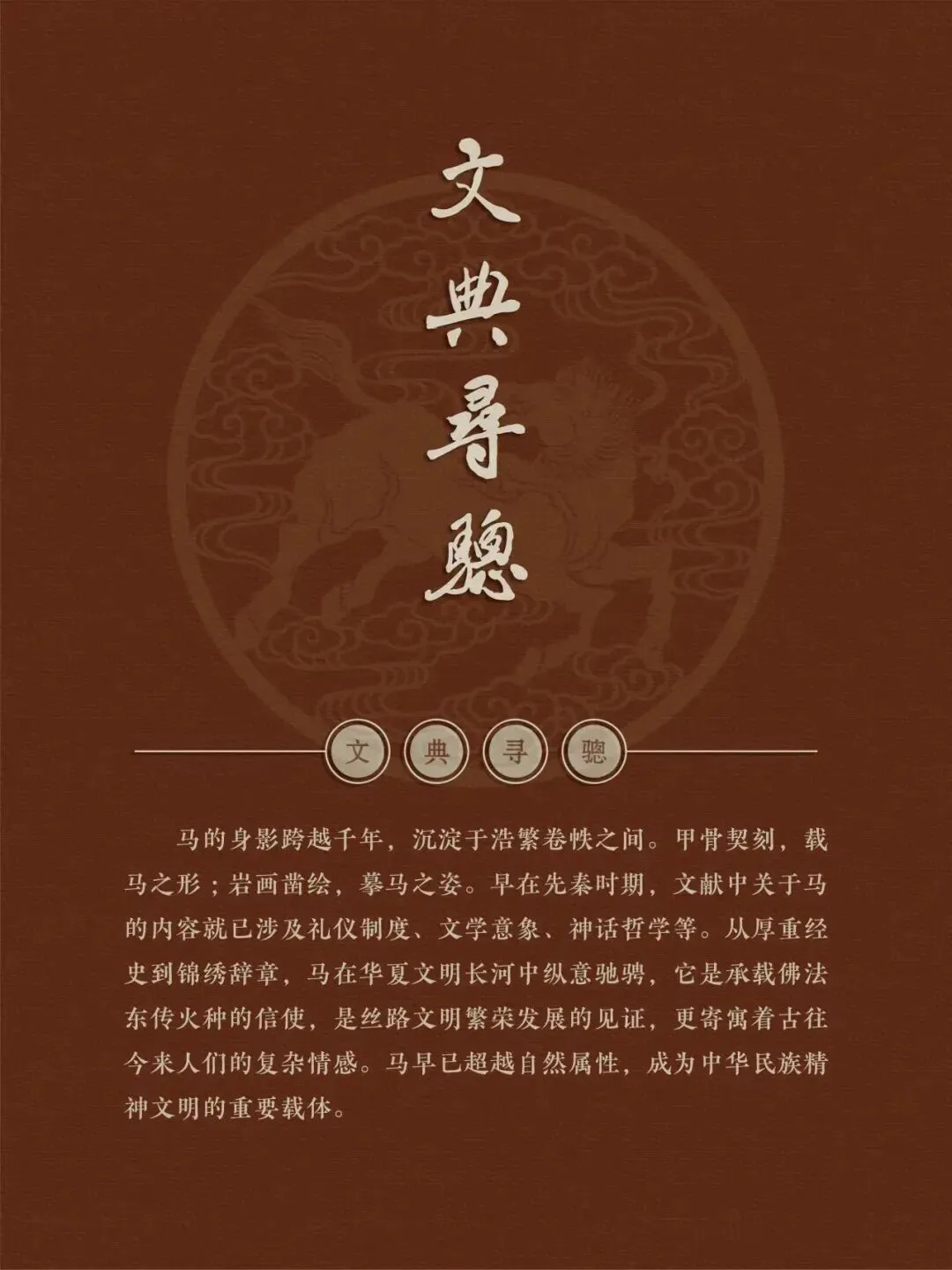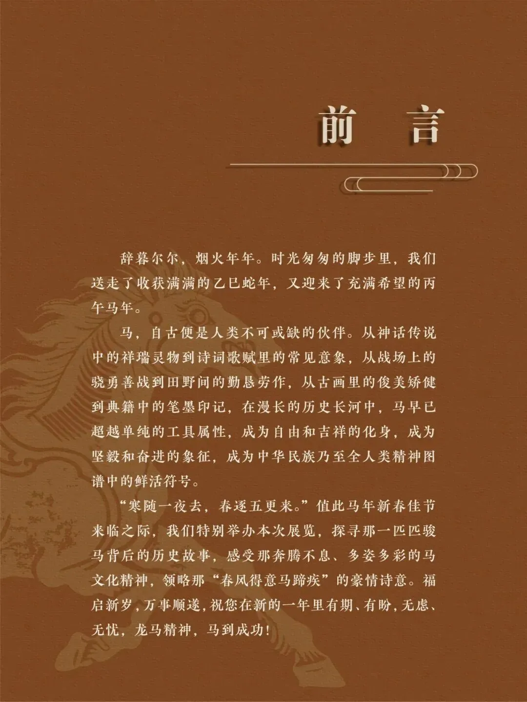 值此马年新春,我们特别举办本次展览,探寻那一匹匹骏马背后的历史故事,感受那奔腾不息,多姿多彩的马文化精神,领略那"春风得意马蹄疾"的豪情诗意。