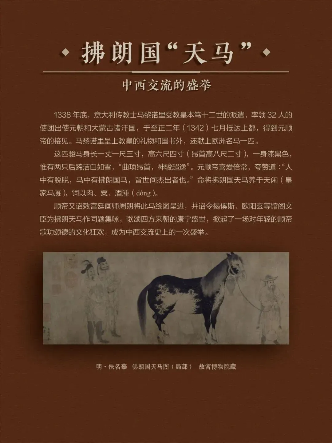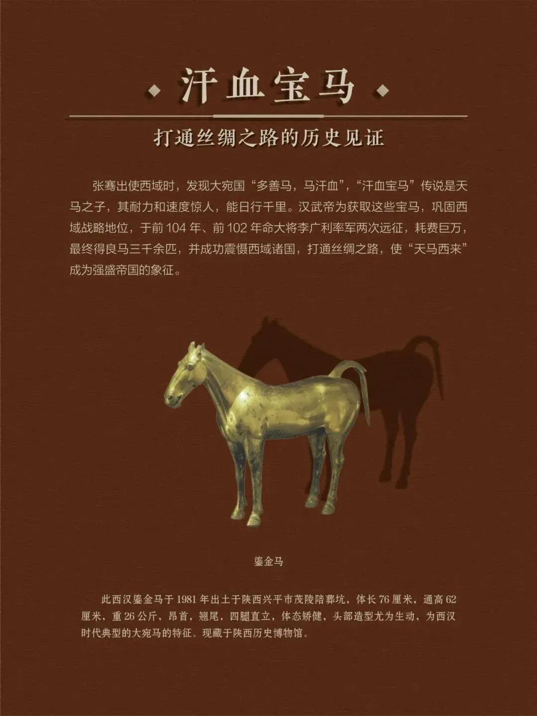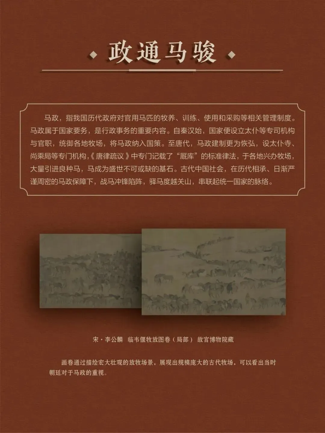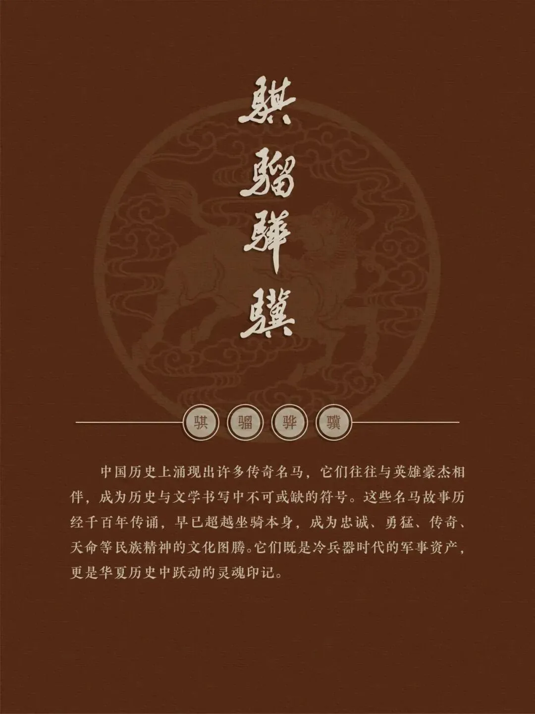 值此马年新春,我们特别举办本次展览,探寻那一匹匹骏马背后的历史故事,感受那奔腾不息,多姿多彩的马文化精神,领略那"春风得意马蹄疾"的豪情诗意。