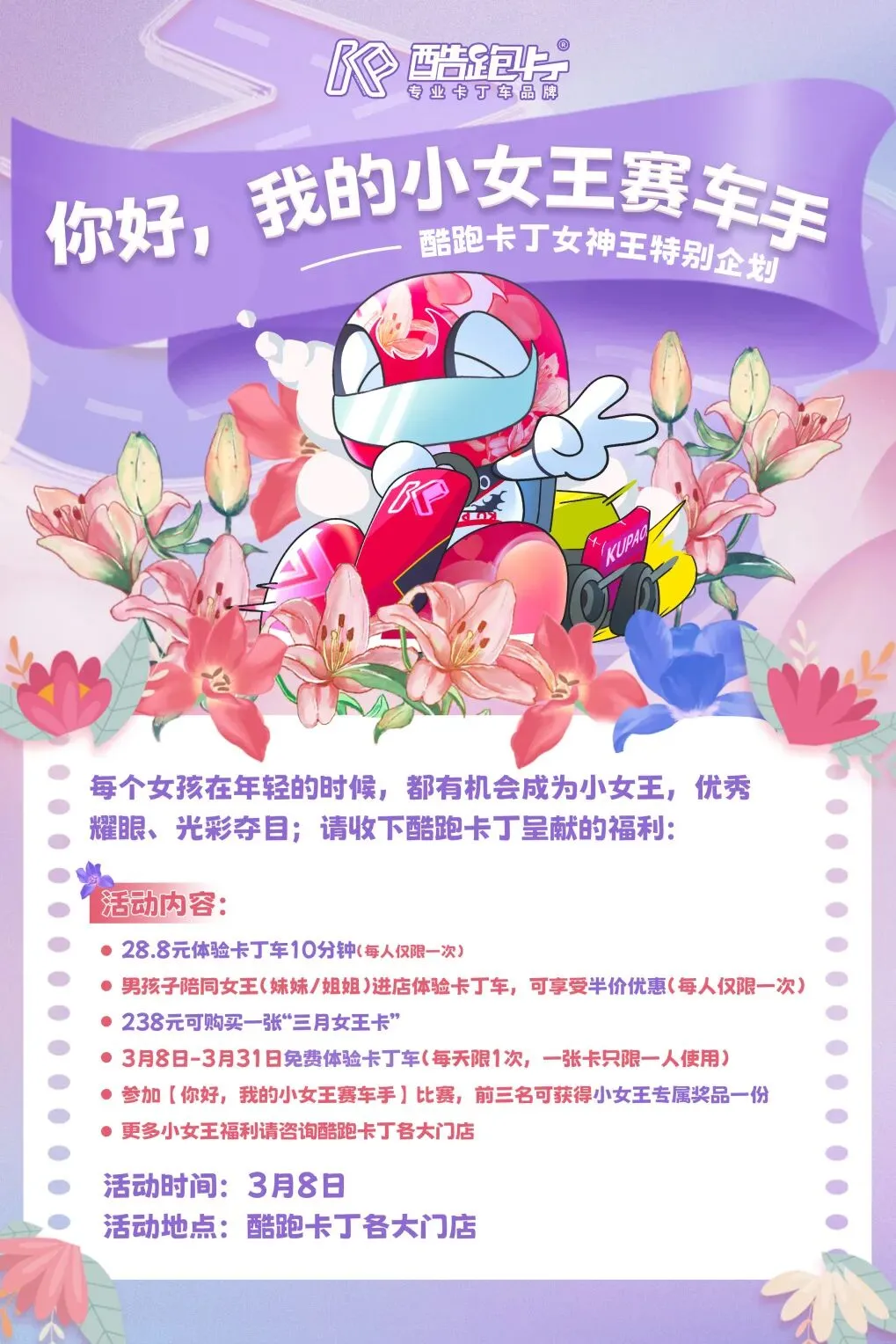 酷跑卡丁是专为 3 岁以上儿童开设的卡丁车竞速馆,是专业全生态化产业链卡丁车品牌,融合「赛车+亲子+培训+派对」复合场景,聚力打造沉浸式亲子互动赛车和拟真 F1 方程式竞赛体验。