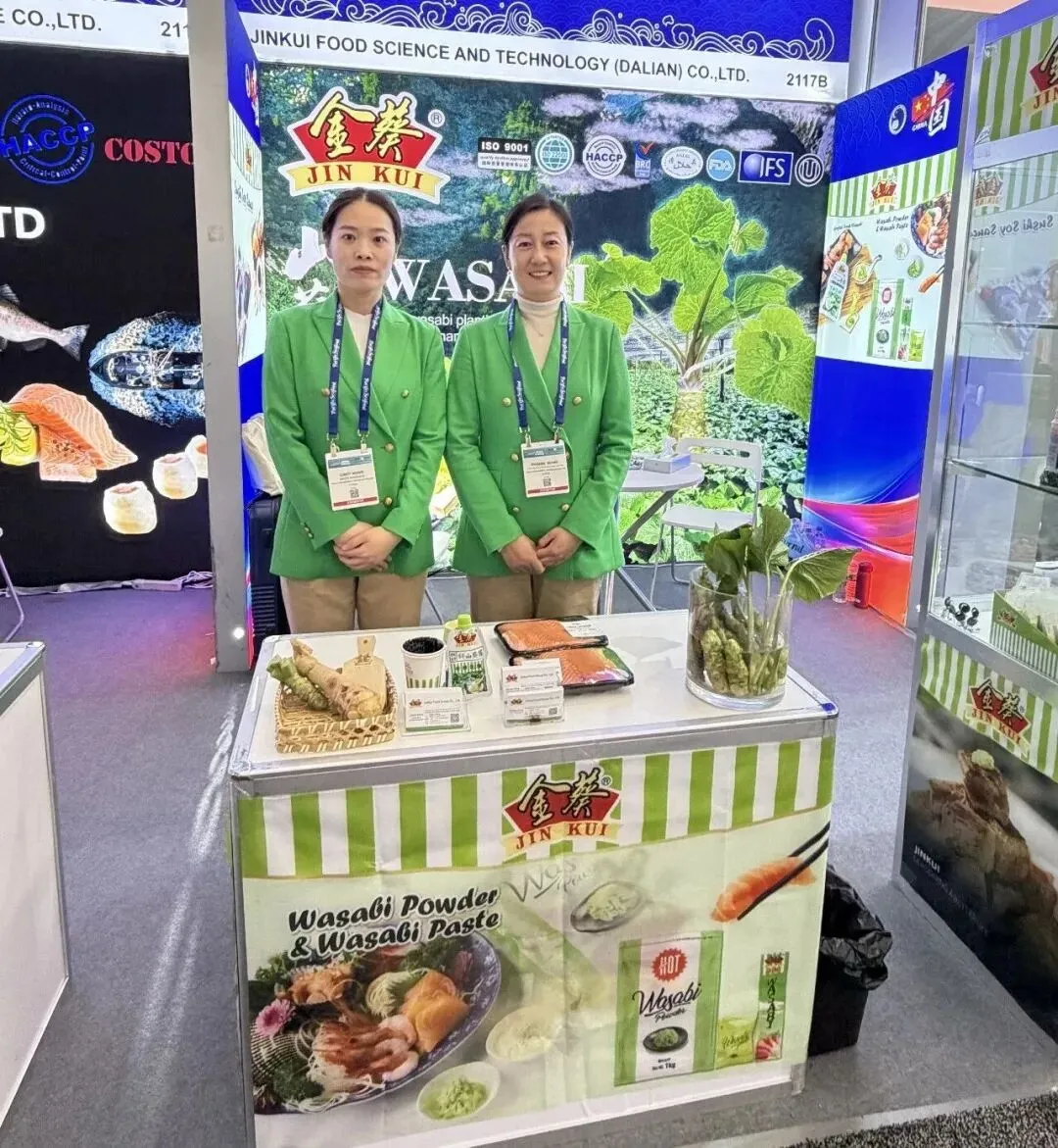 金葵山葵酱保留了山葵特有的清香回甘与辛香爽口,同时在风味上不断创新,成为海鲜、烤肉等多种美食场景的“灵魂伴侣”。山葵在日本被生物学专家认定为稀缺的天然功能性植物,具有杀菌、抑菌、抗癌、预防血栓、调节肠胃功能、提高免疫力等多重功效,其萃取物富含异硫氰酸酯等成分,在保健、医药、护肤等领域应用潜力巨大。 金葵食品展位上,山葵产品摆满了展示台,吸引了众多参观者驻足品尝。参观者们对金葵食品的山葵产品赞不绝口,认为它以其独特的辛辣与清新,充分激发了海鲜的天然鲜味,使整体风味更加浓郁且富有层次感,令人回味无穷。
