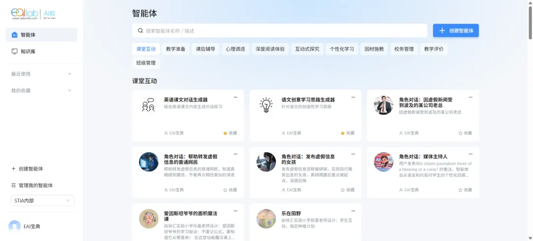 AI教:EAI人工智能备课平台,依托先进的大语言模型技术,以知识库工作流的方式,助力教师的教学设计与作业设计,为教师提供智能教学解决方案。无论是大单元课程、项目化课程设计的灵感激发,还是作业设计的精准把握,EAI备课平台都以智能化的方式,助力教师提升备课效率、优化教学资源,教师还可以在平台上利用各种工作流搭建个性化的智能体。