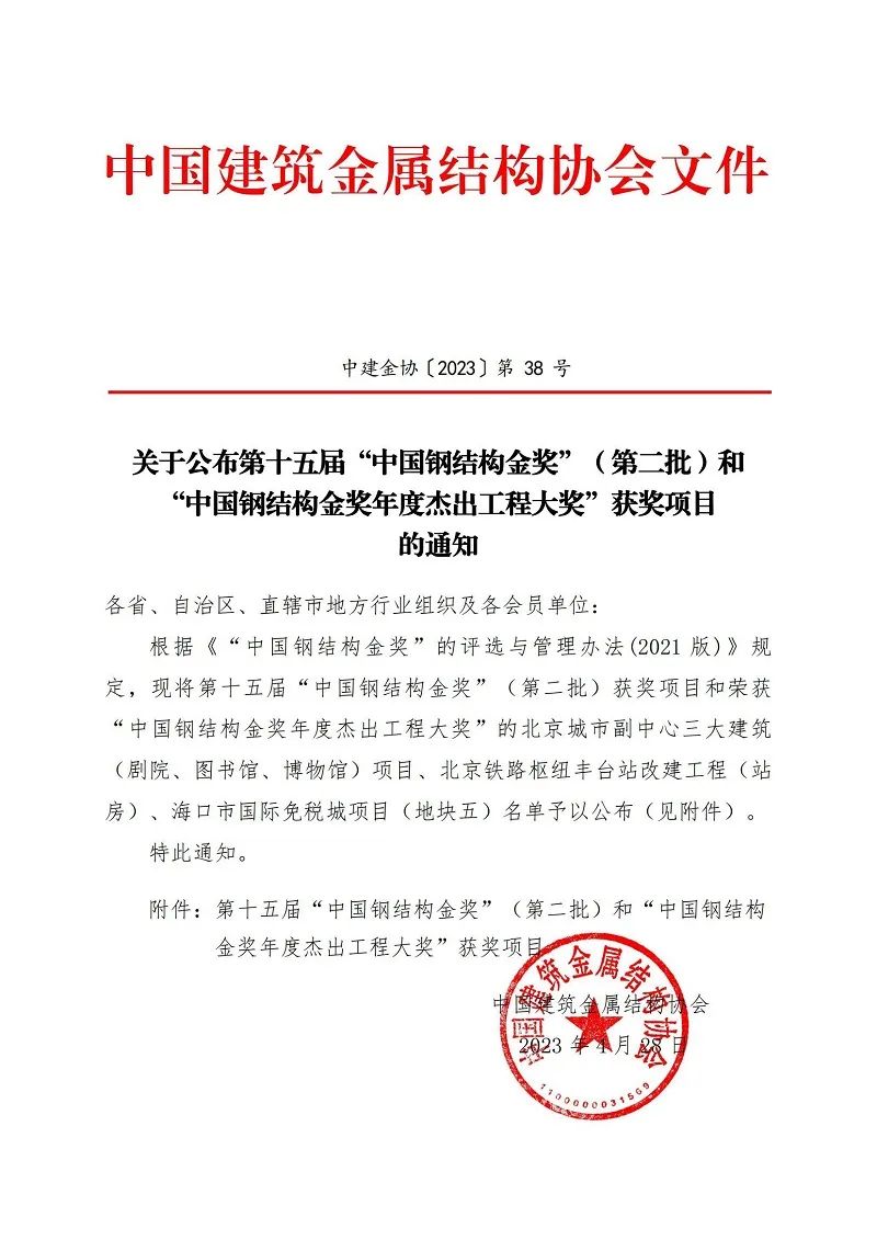 近日,由中国建筑金属结构协会评选的“第十五届中国钢结构金奖(第二批)”公布评选结果,公司联合承建的桂林国际会展中心1#展览中心项目获此殊荣。