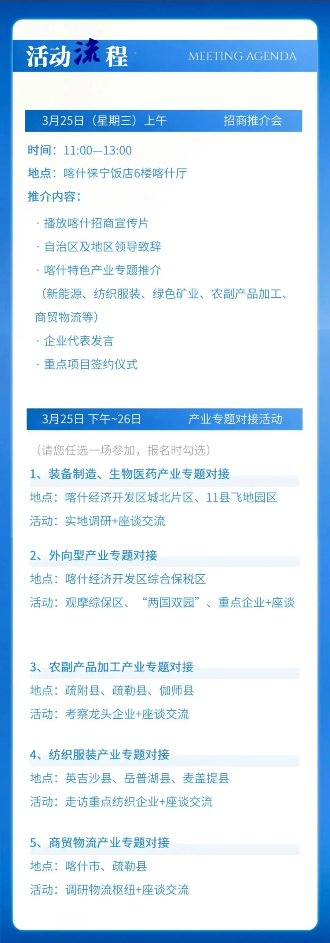 本次活动将全面展示喀什特色优势产业、优质投资环境与叠加政策红利,搭建政企精准对接、务实合作的高效平台。欢迎您走进喀什,感受喀什产业发展脉动,与喀什一道,共话合作愿景,同绘发展蓝图!