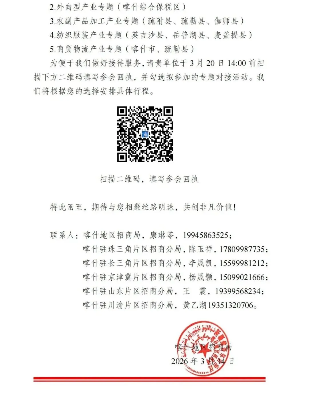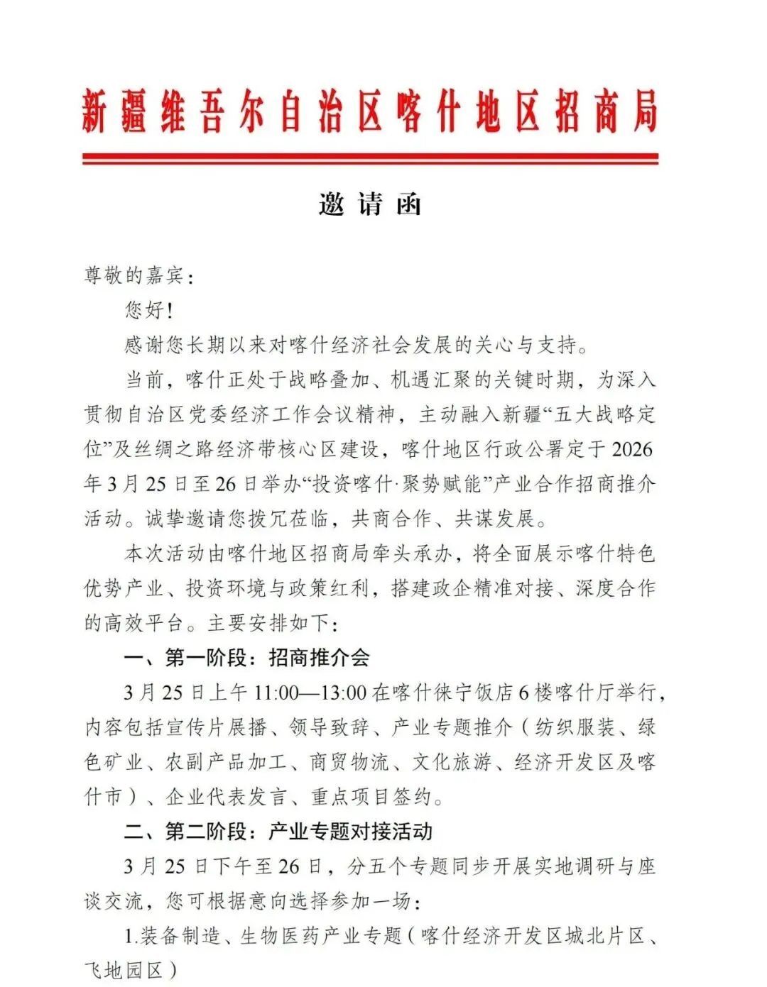 千年丝路焕新彩,机遇喀什正当时。新疆维吾尔自治区喀什地区招商局诚邀您于参加于2026年3月25日~28日在喀什举办的“投资喀什 聚势赋能”产业合作招商推介活动。