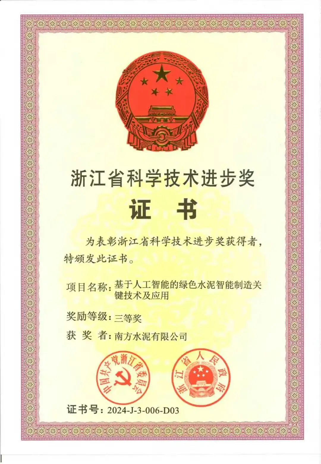 近日,浙江省科学技术奖揭晓,南方水泥主导的“基于人工智能的绿色水泥智能制造关键技术及应用”项目荣获科学技术进步奖三等奖。