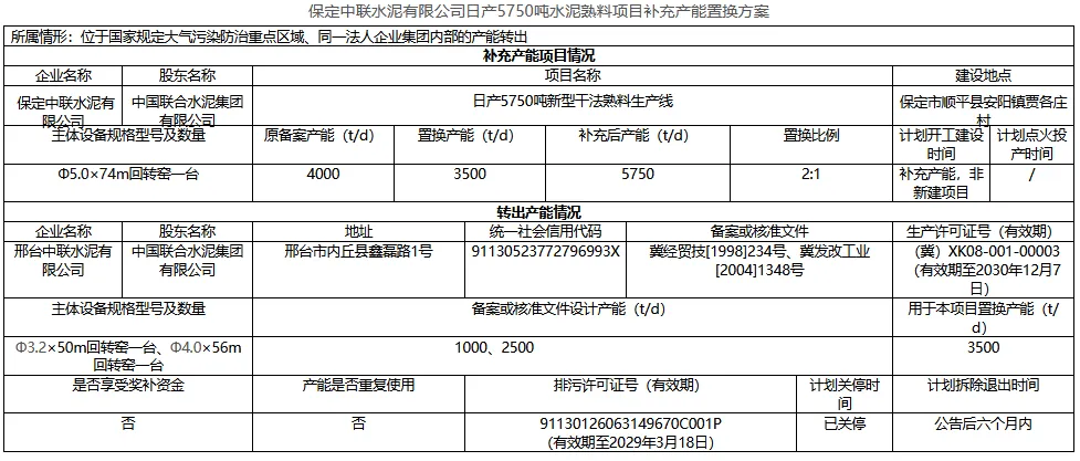 邢台中联水泥退出一条1000t/d、一条2500t/d熟料生产线,产能用于补充保定中联水泥一条4000t/d熟料线,补齐后产能5750t/d,置换比例2:1。