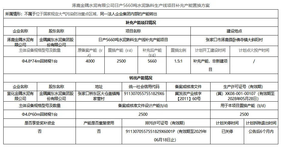 宣化金隅水泥退出一条2500t/d熟料生产线,产能用于补充涿鹿金隅水泥一条4000t/d熟料线,补齐后产能5660t/d,置换比例1.5:1。