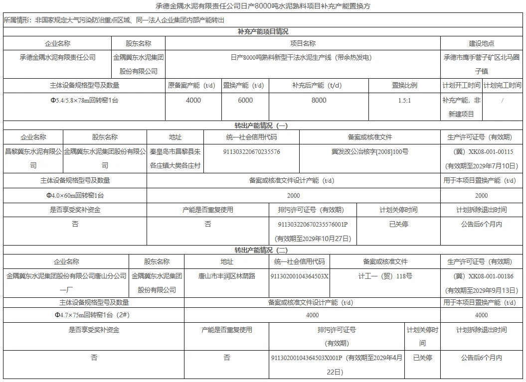 昌黎冀东水泥退出一条2000t/d熟料线,金隅冀东水泥唐山分公司退出一条4000t/d熟料生产线,产能全部用于补充承德金隅一条4000t/d熟料线,补齐后产能8000t/d,置换比例1.5:1。
