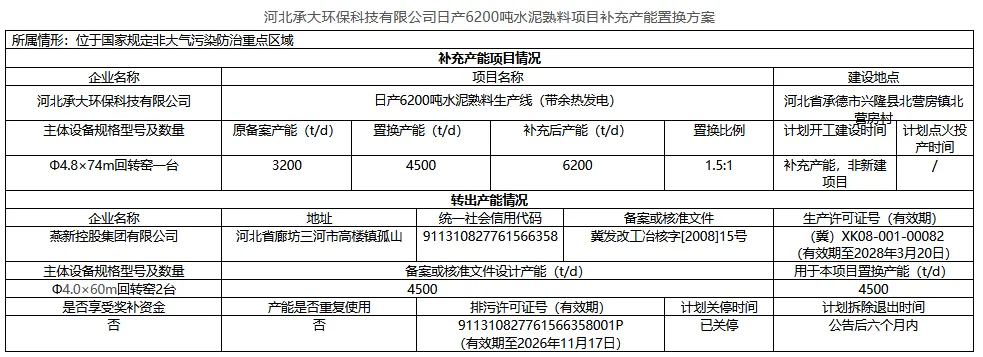 燕新控股集团有限公司退出2条熟料生产线(产能合计4500t/d,产能全部用于河北承大环保科技有限公司一条3200t/d生产线补充产能,补齐后产能6200t/d,置换比例1.5:1。