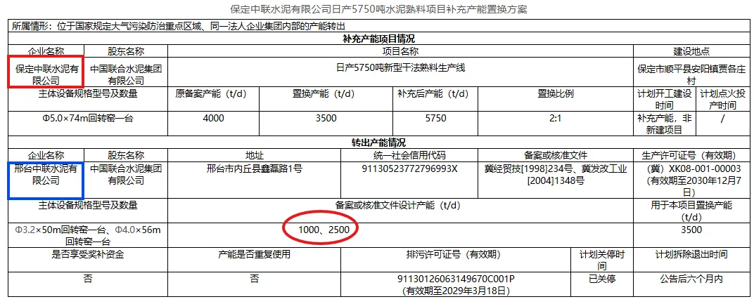 邢台中联水泥有限公司一条1000t/d和一条2500t/d熟料线用于本项目置换产能,目前两条生产线均已关停,计划公告后六个月内拆除退出。
