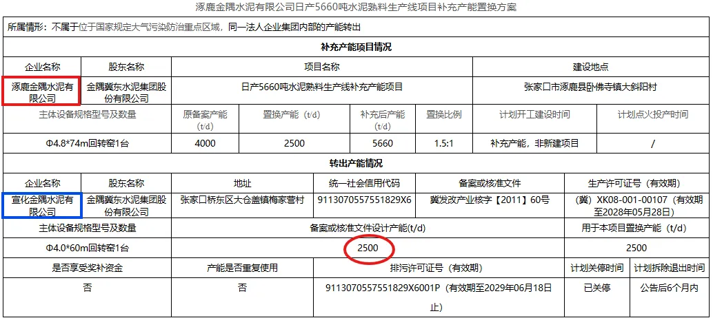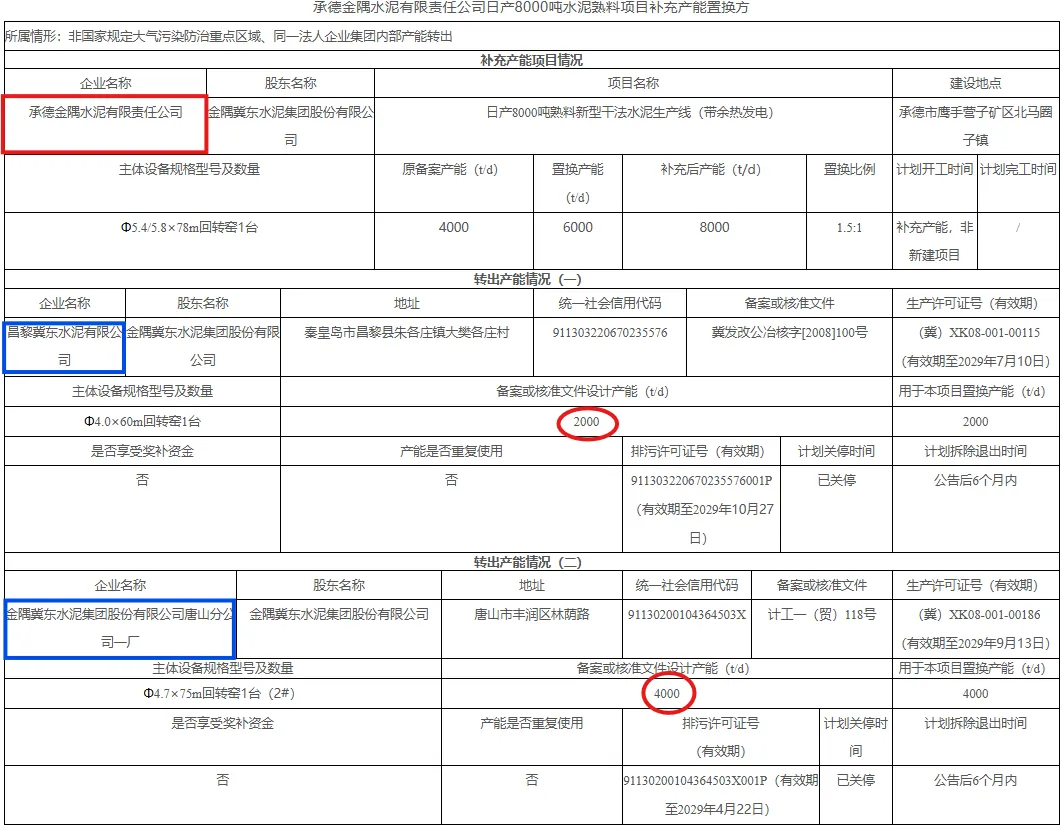 昌黎冀东水泥有限公司一条2000t/d熟料线和金隅冀东水泥集团股份有限公司唐山分公司一厂一条4000t/d熟料线用于本项目置换产能,目前两条生产线均已关停,计划公告后六个月内拆除退出。