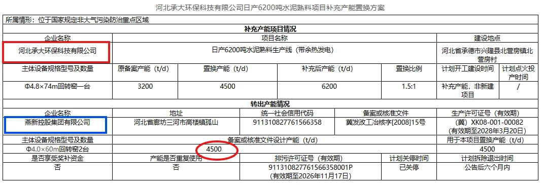 河北承大环保科技有限公司日产6200吨水泥熟料生产线(带余热发电)原备案产能3200t/d,置换产能4500t/d,置换比例为1.5:1。