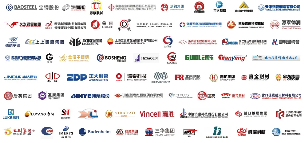 宝钢股份、包钢股份、荣程联合、中信泰富特钢集团股份有限公司、沙钢集团、中国五矿、方大特钢、青山控股集团、天津钢管制造有限公司、友发钢管集团、无锡市特钢材料有限公司/德新钢管(中国)有限公司、金州、华岐、京华制管(天津)有限公司、安徽天康特种钢管有限公司、博爱管道科技集团、源泰德润、德威不锈、上上德盛集团、义腾金属、上海宝世威石油钢管制造有限公司、长江钢管、迈科管业控股有限公司、浙江隆达不锈钢有限公司、惠利通钢管、天津腾飞钢管有限公司、浙江银隆不锈钢有限公司、金信不锈钢、博盛集团、湖州高林不锈钢制造有限公司、浙江春宇不锈钢有限公司、国乐、天津市天洋发线材有限公司、远扬管业、志达管业、界达、正大制管、瑞泰科技、奥镁贸易(大连)有限公司、北京利尔、青花集团、真金耐材、金龙集团、后英集团、圣泉集团、兴业股份、山东耐火材料集团有限公司、凯诺斯、国良、营口豫辰集团、上海热像科技股份有限公司、五耐集团、濮阳濮耐高温材料(集团)股份有限公司、益瑞石、博德精细化工(上海)有限公司、红鹰集团、三华集团、戈尔(深圳)有限公司、杭摩新材料集团股份有限公司、科瑞耐材、自立控股等企业。