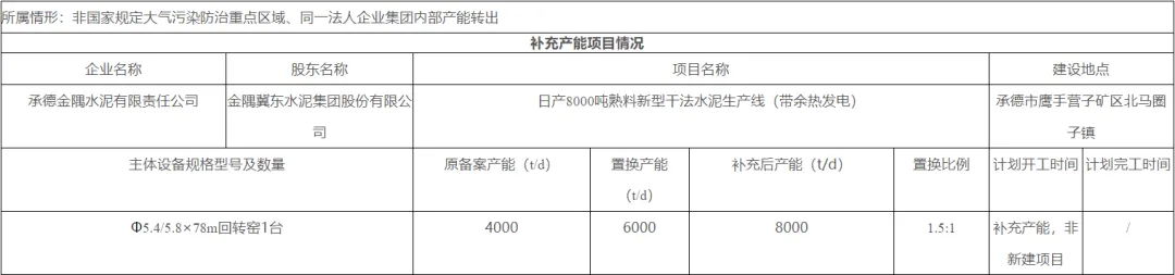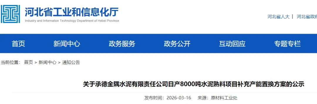 3月16日,河北省工信厅发布关于承德金隅水泥有限责任公司日产8000吨水泥熟料项目补充产能置换方案的公示。