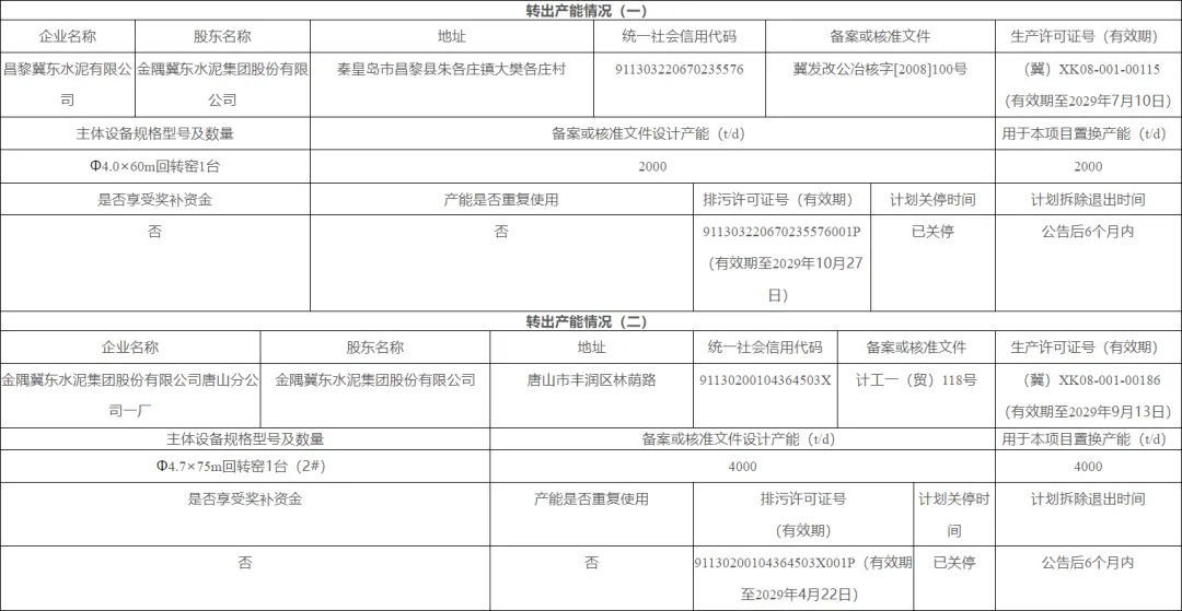 置换产能分别来自昌黎冀东水泥有限公司一条2000t/d水泥熟料生产线和金隅冀东水泥集团股份有限公司唐山分公司一厂一条4000t/d水泥熟料生产线。根据文件,两条产线均已关停,并计划公告后6个月内拆除退出。