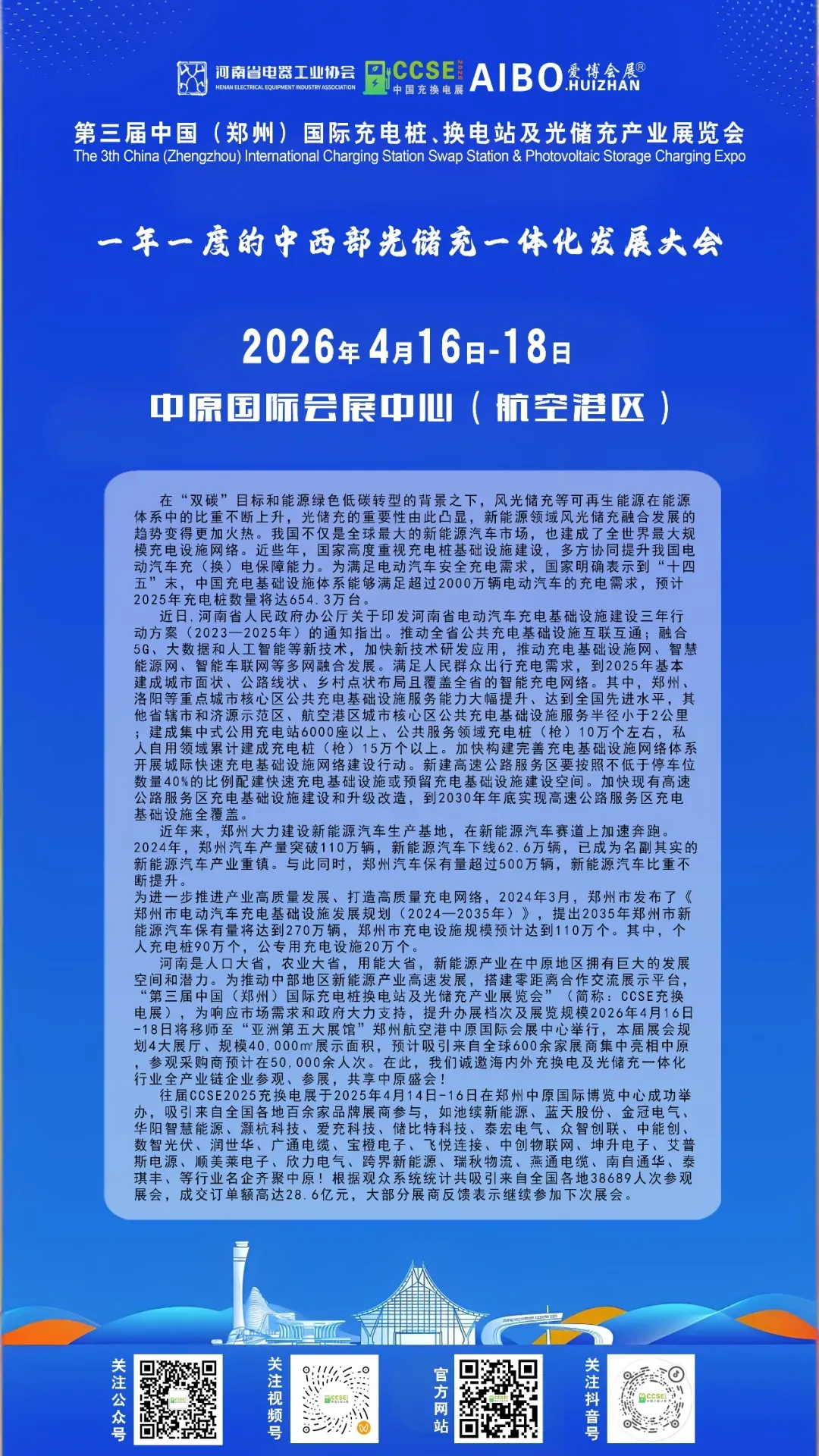 河南是人口大省,农业大省,工业大省以及用能大省,光储充换在中西部市场拥有巨大的发展空间和潜力。为推动中西部地区光储充产业蓬勃发展,搭建零距离合作交流平台,“第三届中国(郑州)国际充电桩、换电站及光储充产业展览会”(简称:CCSE中原充换电展),为响应市场需求和政府大力支持,提升展会档次及办展规模2026年4月16日-18日将在“亚洲第五大展馆”中原国际会展中心(航空港区)展馆举行,本届展会重点凸显光、储、充、换等新型新能源应用终端四大主题展区全面呈现新能源领域前沿产品与创新解决方案。在此,我们诚邀海内外光储充行业全产业链企业参观、参展,共享中原盛会!