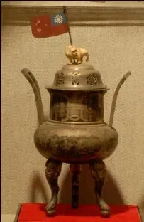 广州九十六工团代表赠送给孙中山的刻有“定鼎中原”四字的银鼎。(上海孙中山故居纪念馆藏)
