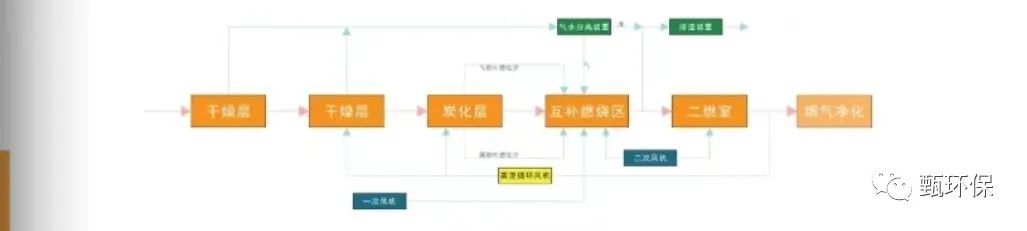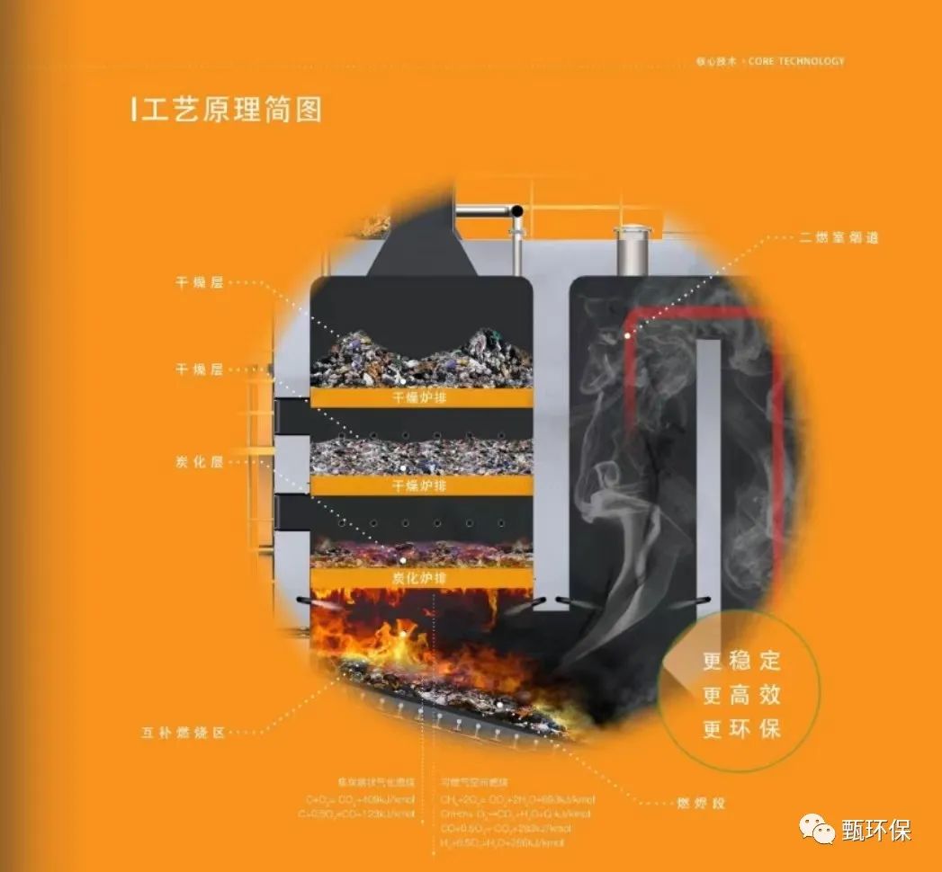 续盈环境是我很喜欢的一个企业,围绕县域多元固废处理及能源化利用,农村及乡镇生活垃圾处理等有诸多案例。该司的技术为气炭互补燃烧工艺。垃圾经过炉内干燥层逐级干燥后进入炭化层,在炭化层完成热解气化过程,分解产生气相可燃物,包含甲烷、氢气、一氧化碳等,这些气相可燃物在互补燃烧区进行空间燃烧,焦炭、半焦等固态可燃物在炉排上进行层状燃烧,气固两相剧烈燃烧,上下互补,形成均匀的火焰和温度场。烟气进入二燃室烟道,炉渣排入渣坑。