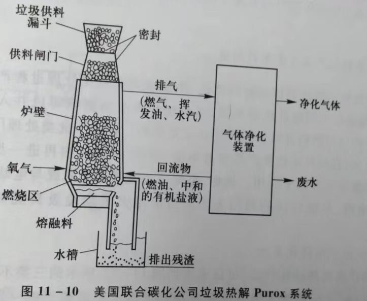 最早开展固体废物热解处理的是美国联合碳化公司,使用的热解工艺设备如图,称为Purox系统。主要设备为纵向气化热解炉,废物由顶部料斗落入灰膛,氧气由底部注入燃烧区,与热解产生的碳渣反应。炉体产生的热量足以熔融废物中的金融、玻璃与其他惰性物质,并连续由底口流入水淬槽形成的水淬渣。由氧与炭渣反应生成的热气流上升,与下落的物料接触,在炉体中部的热解区内,有机物被热裂解(600 ~800C),产生混合气体。气体上升过程与下落"流逆向接触,使之预干燥与升温。由炉体排出的气体含有水袭气、凝油雾与粉尘等杂质,经净化器与冷凝器处理,即获得燃气。系统中有机物转化率约为70%。