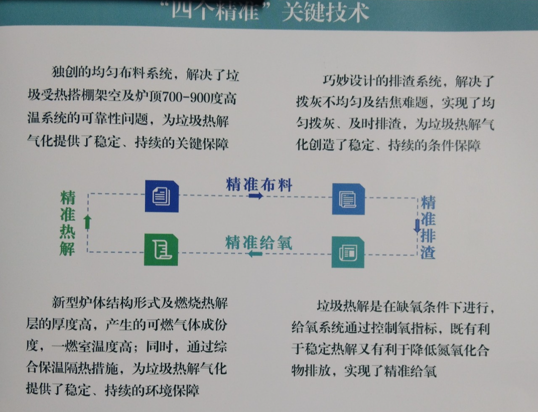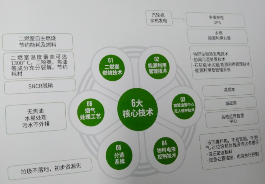 技术优势:二燃室燃烧技术、能源利用管理技术、智慧运营中心无人值守技术、物料电液控制技术、分选系统、烟气处理工艺